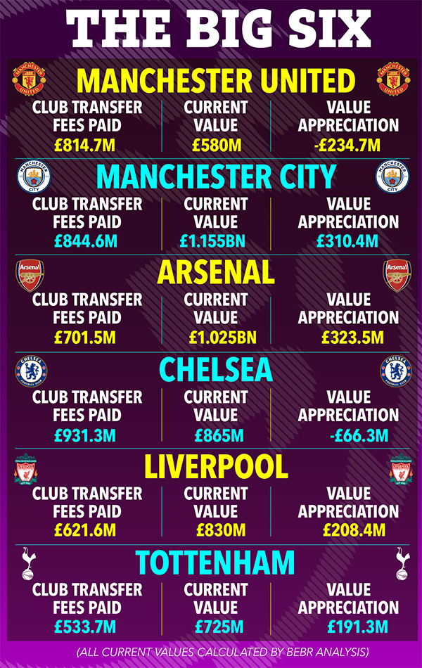 BEBR董事总经理马里伊·哈埃克解释说:「我们的财务、商业和表现数据数据库,与一个由50多名科学家组成的团队结合使用,以给出球员的准确价值。与这些球员的最初购买价格相比,曼联球员的身价贬值在传统六强中最大,而曼城的价值增值最高。」