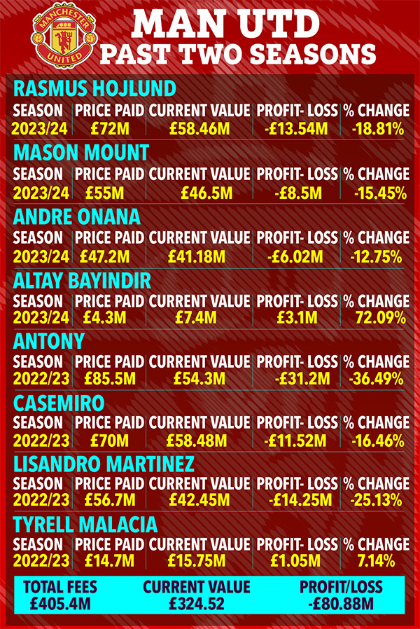 过去两个赛季,曼联花费了4.054亿英镑,其中超过1.5亿英镑用于霍伊伦德和安东尼两人。滕哈格引进的8名球员现在的身价为3.2452亿英镑,减少了近8100万英镑。曼城同期在10名球员身上投入的3.943亿英镑,现在这些球员的价值提升到了4.18615亿英镑,利润为2430万英镑。