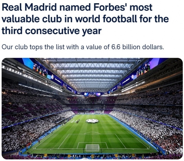 皇马登顶!福布斯2024年世界最有价值足球队榜首