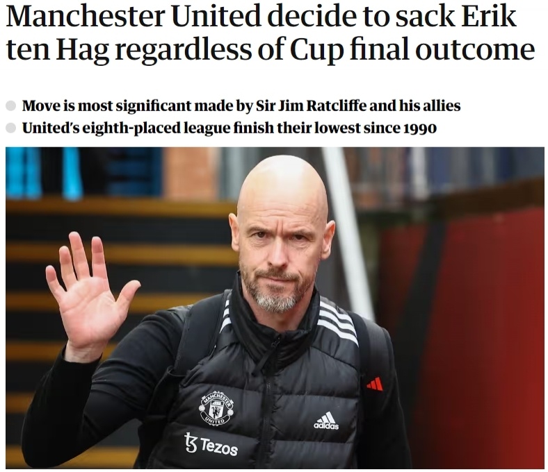尽管曼联依然有机会通过足总杯冠军,避免本赛季“四大皆空”的尴尬,但曼联新老板拉特克利夫爵士却下定决心,不会因为足总杯决赛的结果改变换帅的决定。这也意味着,荷兰人即将提前1年,结束自己在曼联的执教生涯。