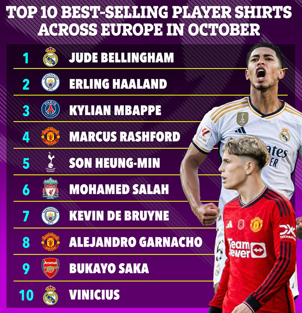 在销售榜上,夏窗1.15亿英镑加盟皇马的裘德·贝林厄姆雄踞第一,他在13场比赛打入13球助攻3次,赢得金球奖中的年度最佳年轻球员奖项。「Fanatics」统计数据表明,10月份他在欧洲球衣销量上高居榜首。