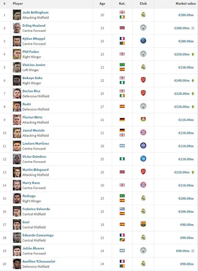 直播车讯 德转英超身价前10公布,哈兰德1.8亿欧领跑,福登1.5亿欧排在第二。