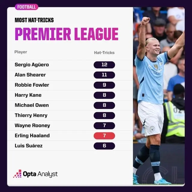 直播车讯 英超戴帽次数排行榜,阿圭罗12次领跑,阿兰-希勒排在第二。