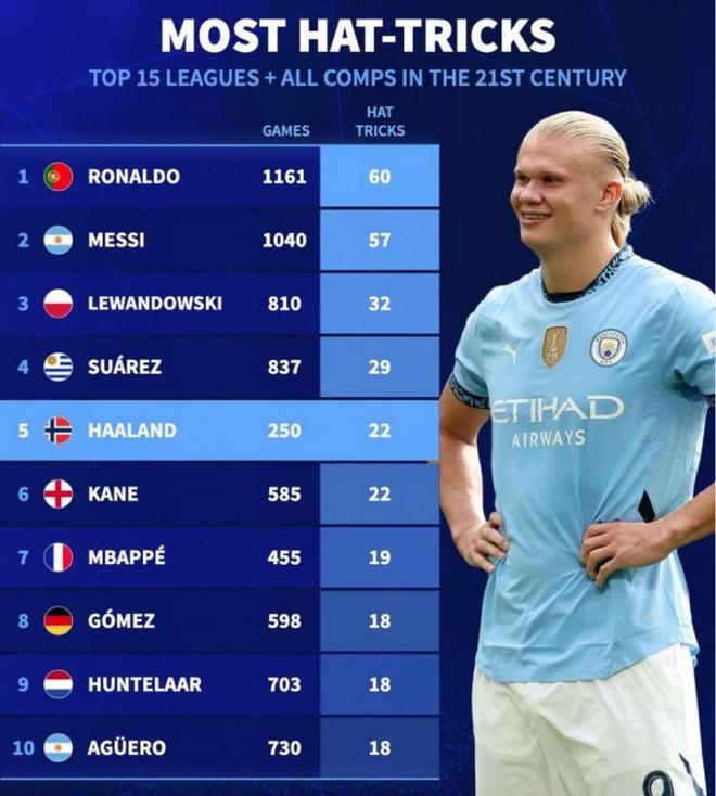 新世纪前15大联赛球员戴帽情况:C罗与梅西断层居首