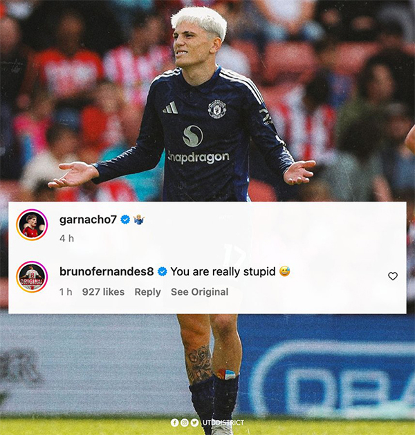 下来后,加纳乔还做出了另一个C罗的经典动作——摊手扁嘴,给球迷带来了更多的谈资。曼联队长布鲁诺·费尔南德斯赛后在社媒上评价了年轻队友的行为:「你真愚蠢啊!」