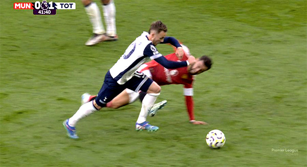 B费当时想要拦截麦迪逊,不料支撑脚打滑,但曼联队长没有收脚,高高抬起另一只脚想要拦截。从一些角度看,他这么做似乎是向对手小腿亮鞋钉。不过,葡萄牙铁人其实只是用脚背外侧触碰到对手。