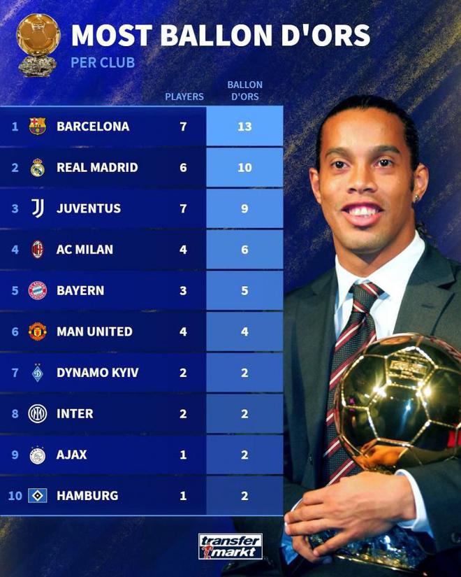 直播车讯德国转会市场统计了各俱乐部球员获得金球的数量,并列出榜单,巴萨以13座金球居首,皇马10座金球次席。