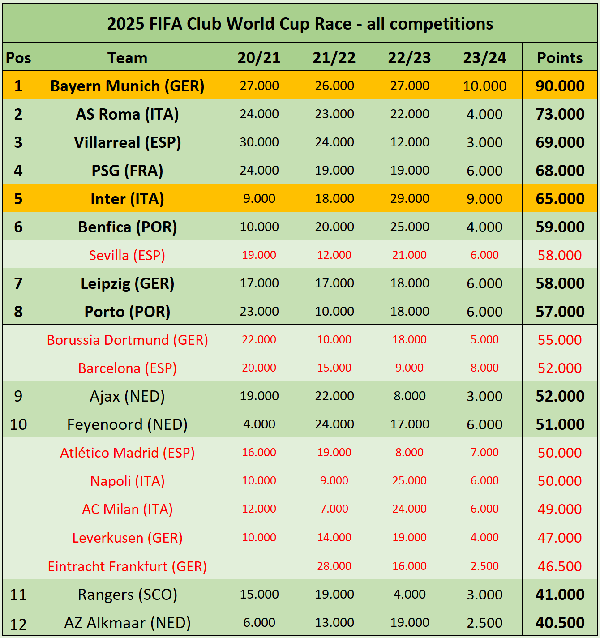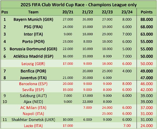 不仅如此,欧足联还规定,每个足协国只能有一支球队通过基于欧战成绩的欧足联系数获得参赛权。按照目前的排名,这意味着曼联、巴萨、国际米兰和多特蒙德,都只能通过赢得本赛季欧冠,才有资格参与新世俱杯赚钱。