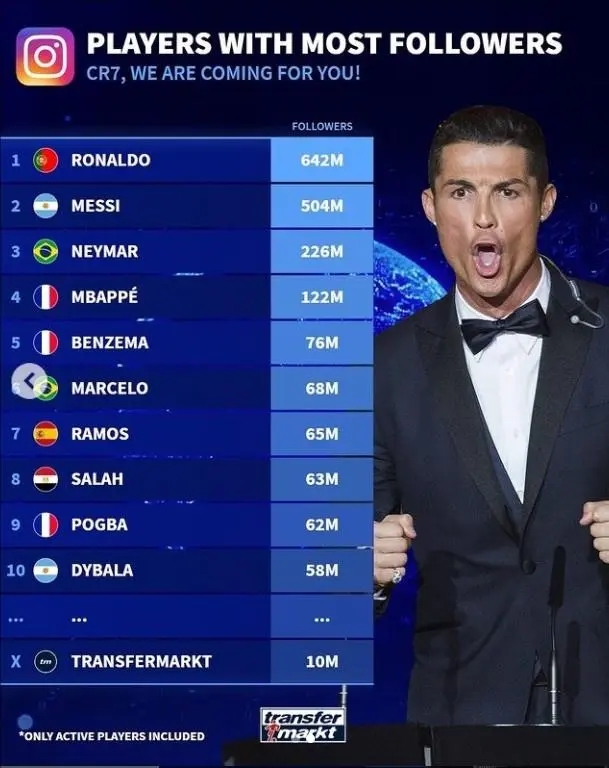 直播车讯德转统计现役球员ins粉丝数,C罗、梅西位列前二,内马尔第三,姆巴佩第四。