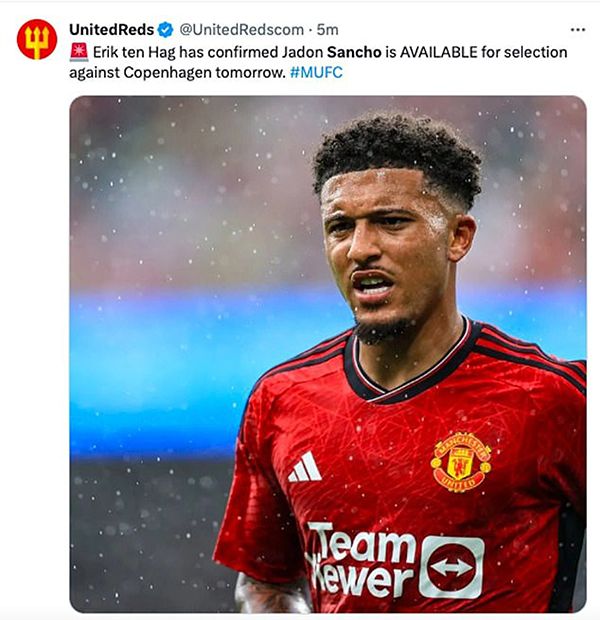 滕哈格当时说:「我们希望(有球员可以复出)。桑乔,他恢复了健康,整个星期都在训练。今天他也会训练,然后我们将评估他是否健康,能否足以参加比赛。」