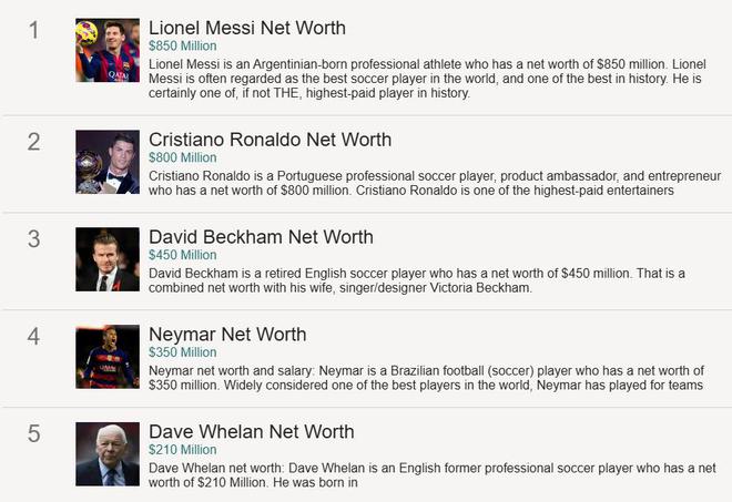直播车讯据专业名人资产统计网站celebritynetworth最新数据,足坛球员(包括已退役)净资产top10中,梅西8.5亿美元第一,C罗8亿第2,小贝第3。