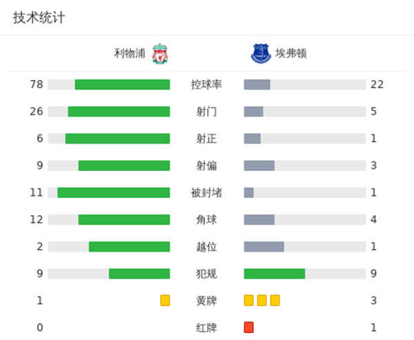 利物浦2-0十人埃弗顿 萨拉赫双响努涅斯送助攻