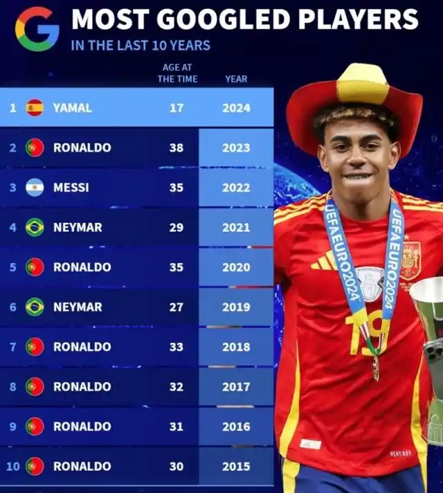 近10年谷歌搜索足坛 “顶流”:C罗6次登顶,谁与争锋?