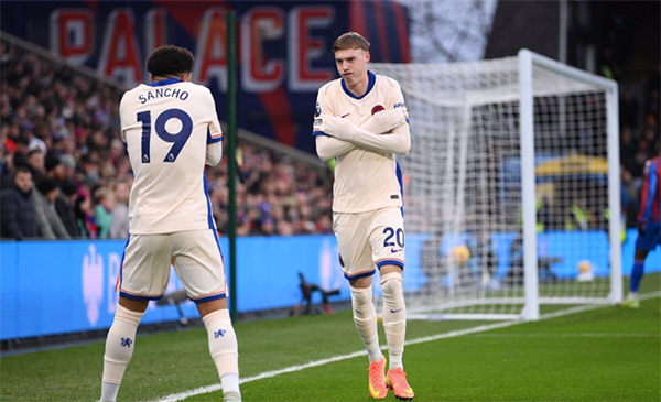 比赛第13分钟,桑乔早早便为切尔西打开局面。他在边线附近灵气十足地人球分过对手,随后潇洒突入禁区之后外脚背巧妙横传,无人盯防的帕尔默轻松斜射破门,为切尔西打破僵局。而帕尔默进球后,也与桑乔一起做出标志性的双手抱肩的庆祝动作。