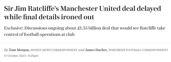 但是在曼联,卡塔尔的退出为拉特克里夫敲定交易铺平了道路,他看起来将以不到14亿英镑的价格购买俱乐部25%的股份,普遍认为这笔交易最终将得到通过。等到英超联盟批准收购方案后,拉爵将接管曼联的体育业务,他打算完成重大改革。