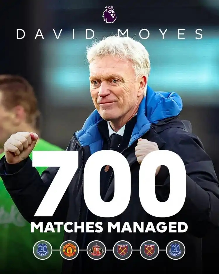 直播车讯 根据英超官方统计,莫耶斯今天迎来执教生涯的第700场英超。