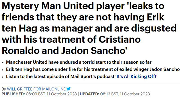 他说:「你知道吗?我知道必须小心报道,这只是我从一个曼联球员那里听到的,他告诉了一个我们非常熟悉的人。但他说,球员们不拥戴主教练(not having the manager),他们不认同他,肯定不。所有人都说他们对滕哈格对待C罗的方式感到反感,他们也认为桑乔是一个非常好的人,他非常努力,所以说实话,我不知道该相信谁。更衣室仍然不对劲?那球员说球员并不认可他。」