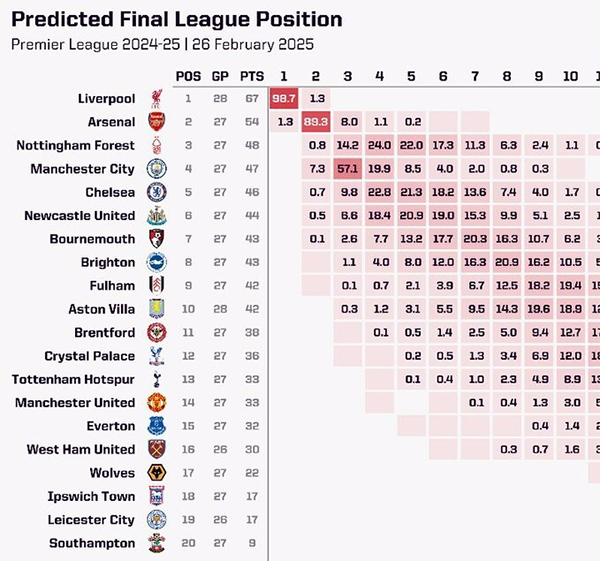 根据Opta超级计算机最新模拟预测,利物浦夺得本赛季英超冠军的概率已高达98.7%,而阿森纳的夺冠概率仅为1.3%。至于卫冕冠军曼城等其他英超18队,夺冠概率已经基本为零。