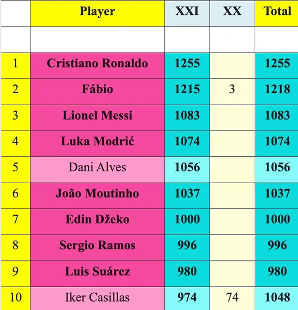 直播车讯IFFHS(国际足球历史和统计联合会)统计了21世纪球员出场次数排行榜,C罗第一,梅西第三