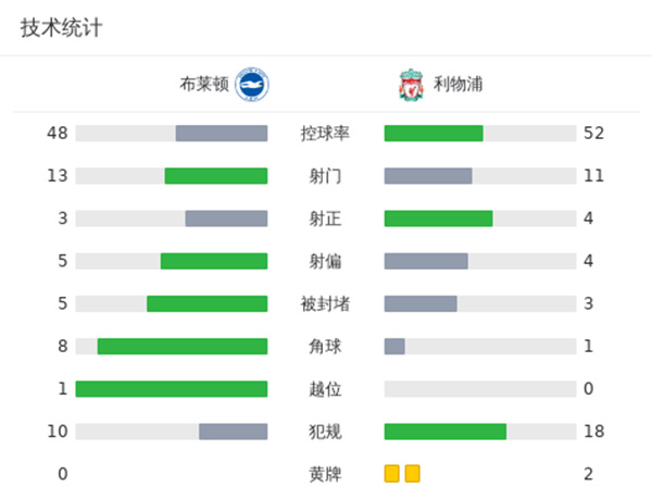 来源:直播车10-09 00:17 直播车讯 :北京时间10月08日英超联赛第8轮,布莱顿主场对阵利物浦。上半场阿丁格拉抓住利物浦后防传球的失误率先破门,萨拉赫梅开二度反超比分;下半场替补登场的赫拉芬贝赫射门击中横梁弹出,随后邓克抢点破门为布莱顿扳平比分,最终双方2-2握手言和。