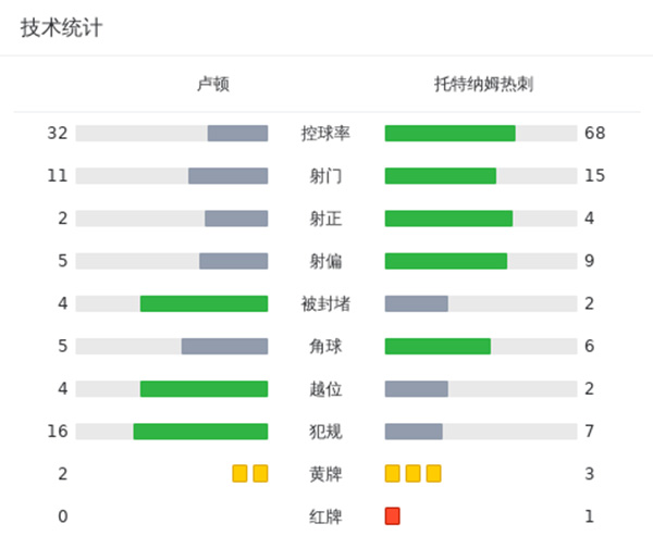 来源:直播车10-07 21:39 直播车讯 :北京时间10月07日英超 联赛 第8轮,卢顿主场对阵托特纳姆热刺。上半场里沙利松连失良机,卢顿破门被吹,比苏马染红,下半场范德芬破门,最终热刺1-0战胜卢顿,暂时登顶积分榜。