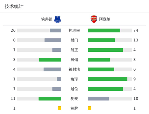 全场比赛结束,最终阿森纳1-0埃弗顿。
