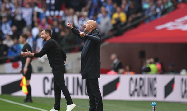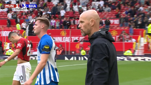 这场比赛结束哨声吹响之后,可以看到曼联的球员们面露难色,有的球员用球衣擦着面部的汗,有的球员低着头,失望的回到更衣室。镜头给到此役战术和用人都备受质疑的主帅滕哈赫,他的脸色铁青。