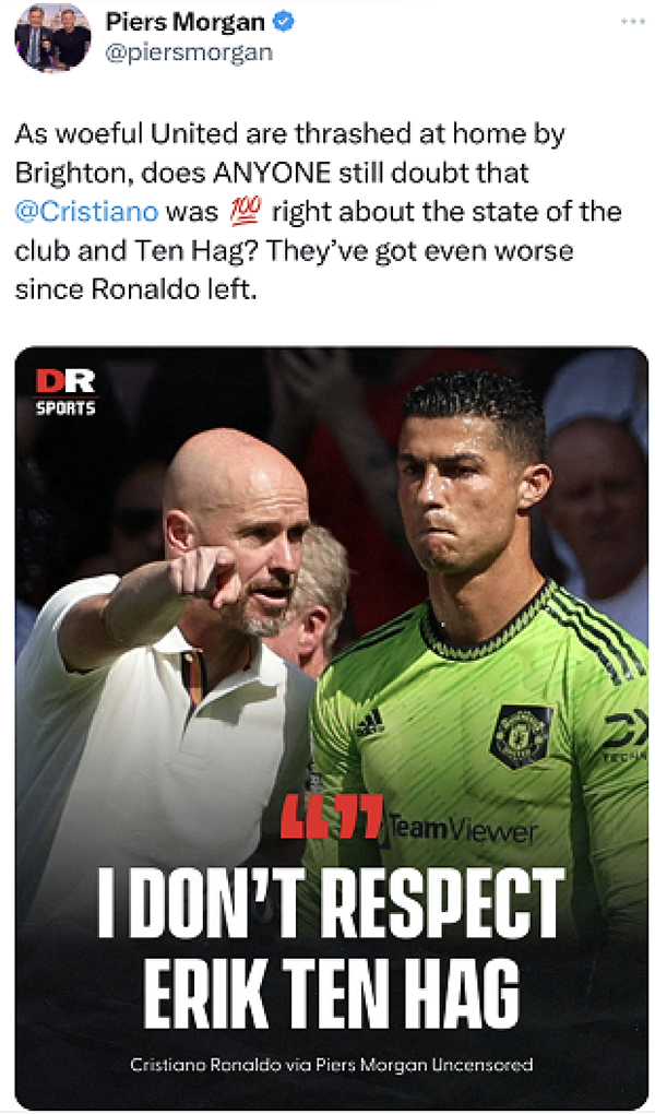 可以说这场比赛的曼联是彻头彻尾的惨败,即便是没有麦卡利斯特等人的布莱顿,依旧可以对阵曼联取得连胜,而上一次曼联击败布莱顿,还要追溯到C罗效力曼联时期。也正是因为这样的原因,此前专访导致C罗离开曼联的名嘴摩根表示:“曼联在主场吞下惨败,C罗当初说曼联的状况还有滕哈赫的那些话,还有人质疑他说的不是100%对吗?C罗走后,他们甚至更差了。”