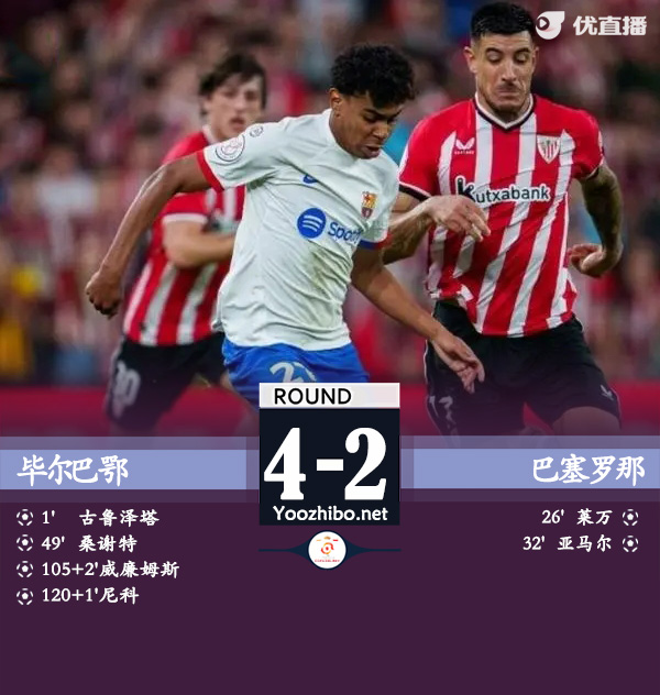 直播车讯 1月25日讯 国王杯1/4决赛,巴萨对阵毕尔巴鄂。上半场开场仅38秒,巴萨后防解围失误,古鲁泽塔闪击破门,莱万同样也是利用毕巴解围失误扳平比分,亚马尔一条龙内切远射反超比分。易边再战桑塞特头槌破门扳平,亚马尔两次错失单刀。常规时间巴萨2-2毕巴进入加时赛。加时赛上半场补时,伊纳基关键破门,下半场补时,尼科锁定胜局。最终巴萨加时鏖战2-4不敌毕巴止步八强。