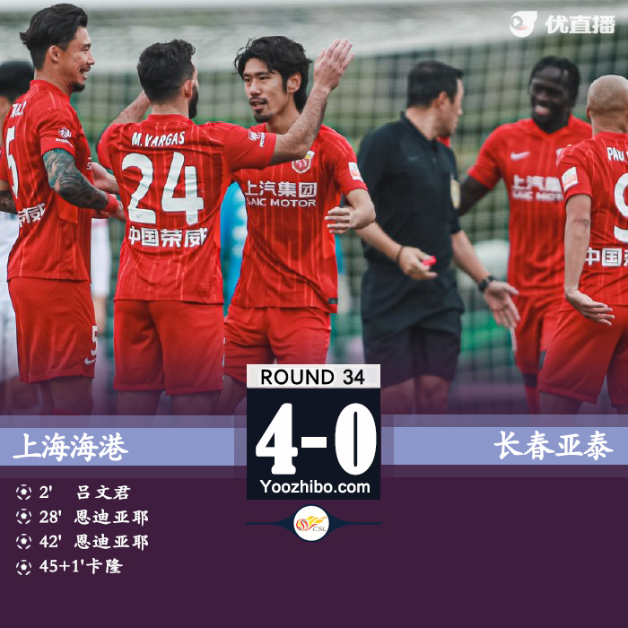 直播车12月31日讯 北京时间12月31日15:00,中超联赛第34轮上海海港迎战长春亚泰的比赛,上半场吕文君闪击,恩迪亚耶双响,卡隆中超首球,下半场双方均无建树,最终海港4-0大胜亚泰。