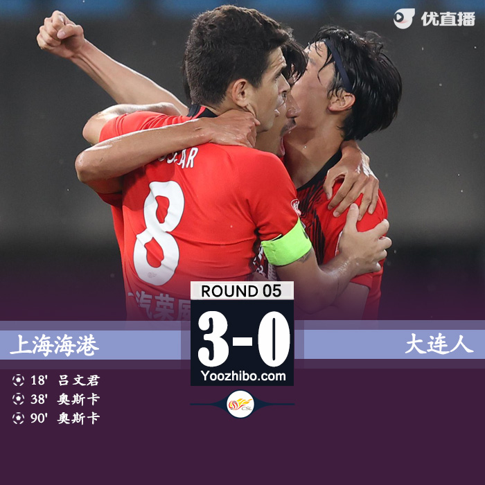 直播车5月16日讯 北京时间5月16日18:00,中超联赛第5轮,上海海港对阵大连人。上半场比赛,李申圆边路传中助攻吕文君破门,奥斯卡中超百场里程碑兜射死角扩大比分。下半场比赛,奥斯卡点球破门完成梅开二度。全场比赛结束,海港3-0战胜大连人。