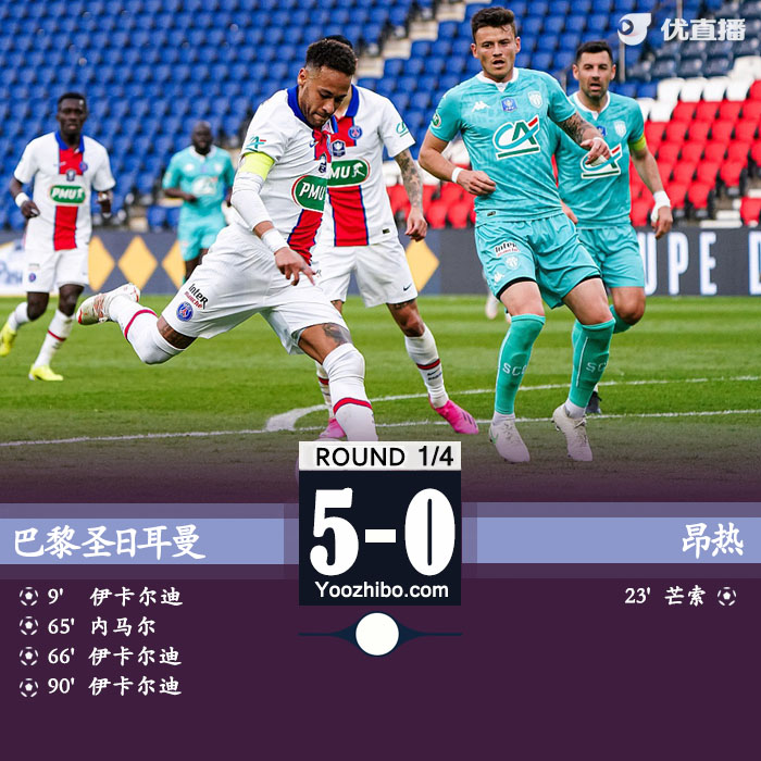 直播车4月22日讯 北京时间4月22日0点45分,法国杯1/4决赛巴黎主场对阵昂热。上半场,伊卡尔迪单刀先拔头筹,内马尔制造芒索乌龙,拉吉半场结束前连续错失良机。下半场,内马尔和伊卡尔迪两分钟内各入一球,终场前伊卡尔迪完成帽子戏法,全场比赛结束,巴黎圣日耳曼5-0昂热。凭借本场大胜,巴黎轻松晋级法国杯半决赛。