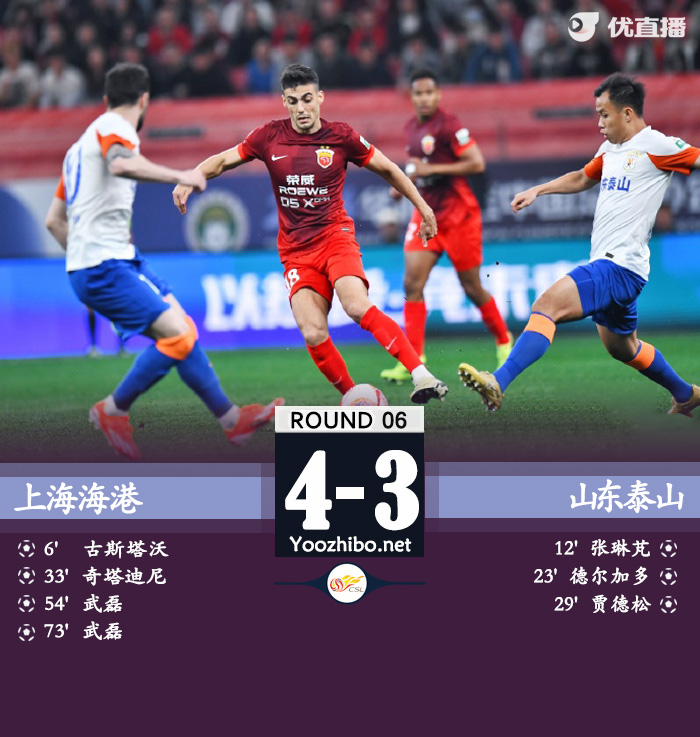 直播车讯:北京时间4月14日,中超联赛第6轮,上海海港主场对阵山东泰山。上半场古斯塔沃开场闪击破门,卡扎伊什维利打门折射扳平,德尔加多小角度抽射扳平,贾德松头球扩大比分,莱奥-奇塔迪尼乱战扳回一球,下半场武磊扳平比分,崔康熙抗议裁判被罚下场,武磊头球梅开二度。最终比分上海海港 4-3 山东泰山。