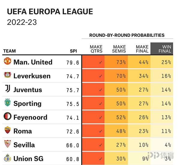 欧联夺冠概率:曼联25% 药厂16% 尤文14% 塞维4%