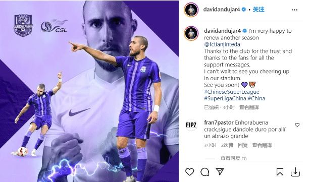 安杜哈尔写道:“很高兴能够与天津津门虎续约1年,感谢俱乐部对我的信任,感谢球迷朋友对我的支持,迫不及待想要在主场与你们见面。”