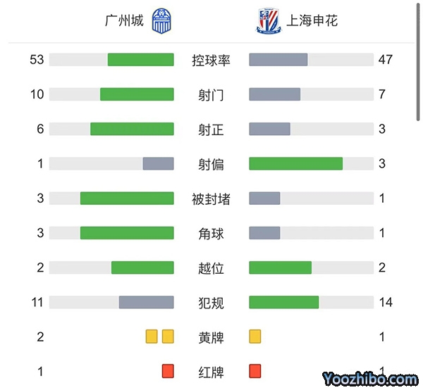 全场比赛结束,广州城1-1上海申花。