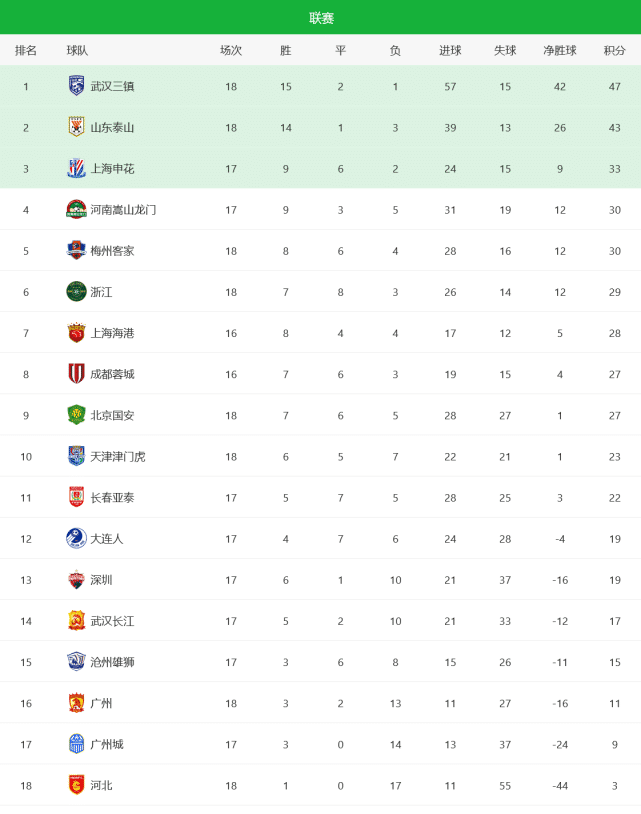 中超最新积分榜,三镇首败只领先4分,泰山队4-0反弹,国安拿1分