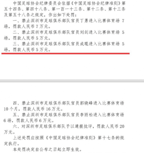 来源:直播车06-28 21:06直播车06月28日讯 ,中超深圳VS成都蓉城比赛引发争议的主裁判张雷及边裁将参加听证会,同时还有深圳方面被认定违规的4-5人,包括总经理和队医。现在足协的处罚结果已经出炉,5名深足俱乐部人员被禁赛罚款,其中最严厉的是被红牌罚下的队医郭晓峰,他被禁止进入比赛体育场10个月,罚款16万元。深足俱乐部通报批评,罚款20万元。这样,足协的罚单中,对深圳队5名官员共罚款39万+俱乐部罚款20万,累计罚款59万元。