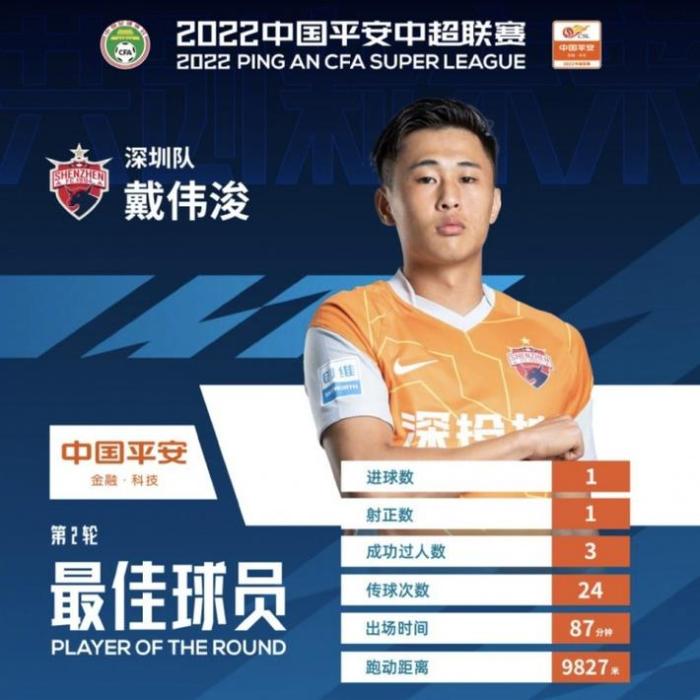 直播车06月11日讯 刚刚,中超联赛官方宣布,深圳队球员戴伟浚当选为中超第2轮MVP。