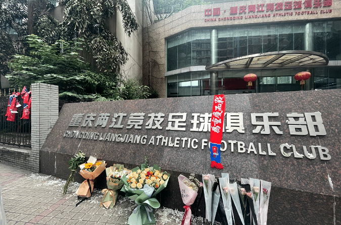 在重庆队宣布解散后,球迷纷纷来到俱乐部门口摆放围巾和鲜花,为心爱的球队送别。