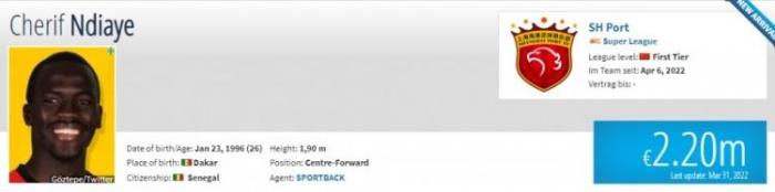 恩迪亚耶来自塞内加尔达卡,司职中锋,今年26岁,身高1.90米,他和海港的合同签到2024年。本赛季他各项赛事为格兹泰佩出场32次打进12球。