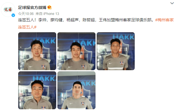 来源:直播车03-22 20:34直播车03月22日讯 今天,升班马梅州客家一口气宣布了5名新援,签下李帅、廖均健、杨超声、陈哲超和王伟。