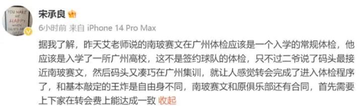 一夜之间,韦世豪和上港男足似乎已经划上了等号,毕竟如果球员都已经到达了体检这一部分,加盟只是时间问题。可是韦世豪真的加盟了上港男足吗?1月27日,事情来到了反转的阶段,为什么呢?媒体人宋承良在社交媒体上爆料:据我了解,昨天艾老师说南波赛文在广州体检应该是一个入学的常规体检,他应该是入学了一所广州高校,这不是签约球队的体检。