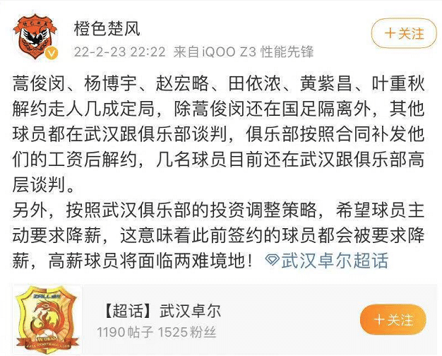 广州队已经官宣确认5名归化强援解约离队,本土主力也将一刀切,顶薪降至一年税前60万,而且只给3个名额,意味着之前的一大批高薪球员将全解约。在广州队阵容断崖式下滑之后,中超保级队武汉队也出现了大雪崩,阵容配置骤降已经不可避免,球队中场核心也是国足队长蒿俊闵已经率先向武汉队讨薪,黄紫昌、叶重秋等人也跟进,武汉队官方的回应是,希望队员和球迷理解,然后呼吁大家主动降薪,与球队共渡难关。