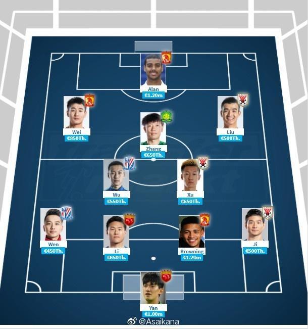 中超国内球员最贵阵容:阿兰120万欧元领衔