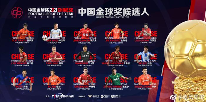 中国金球奖候选名单:郭田雨(山东泰山)、韩佳奇(广州城)、蒋光太(广州队)、金敬道(山东泰山)、洛国富(广州队)、吕文君(上海海港)、谭龙(长春亚泰)、王大雷(山东泰山)、王燊超(上海海港)、武磊(西班牙人)、吴曦(上海申花)、徐新(山东泰山)、严鼎皓(广州队)、张玉宁(北京国安)、郑铮(山东泰山)