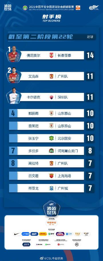 射手榜方面,长春亚泰的巴西外援儒尼奥尔以14球荣获本赛季中超射手王,艾克森、卡尔德克11球并列第二。