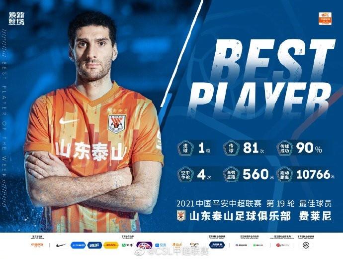 直播车12月29日讯 ,中超官方评选的第19轮比赛最佳球员揭晓,泰山队外援费莱尼以71.1%的得票率当选。