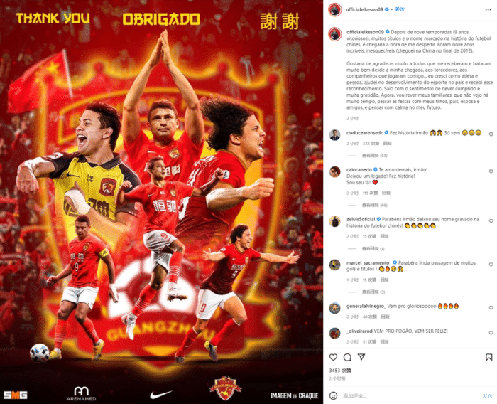 “我想感谢所有从我来到中国之后就接待我并对我非常好的人们、球迷和与我一起踢球的队友们……在中国的这段经历,让我作为一个人和一个运动员都有所成长,我帮助足球运动在国内取得发展,并得到了认可。”