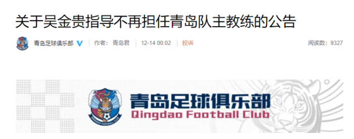 来源:直播车12-14 11:37直播车12月14日讯 今天凌晨,青岛队发布公告,证实吴金贵不再担任球队主教练,杨为健暂代教练一职。